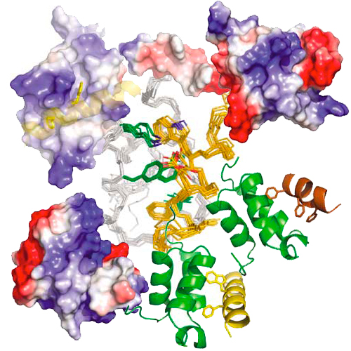Protein import into peroxisomes depends on a complex and dynamic network of protein–protein interactions. Pex14 is a central component of the peroxisomal import machinery and binds the soluble receptors Pex5 and Pex19, which have important function in the assembly of peroxisome matrix and membrane, respectively. We show that the N-terminal domain of Pex14, Pex14(N), adopts a three-helical fold. Pex5 and Pex19 ligand helices bind competitively to the same surface in Pex14(N) albeit with opposite directionality. The molecular recognition involves conserved aromatic side chains in the Pex5 WxxxF/Y motif and a newly identified F/YFxxxF sequence in Pex19. The Pex14–Pex5 complex structure reveals molecular details for a critical interaction in docking Pex5 to the peroxisomal membrane. We show that mutations of Pex14 residues located in the Pex5/Pex19 binding region disrupt Pex5 and/or Pex19 binding in vitro. The corresponding full-length Pex14 variants are impaired in peroxisomal membrane localisation in vivo, showing that the molecular interactions mediated by the N-terminal domain modulate peroxisomal targeting of Pex14.