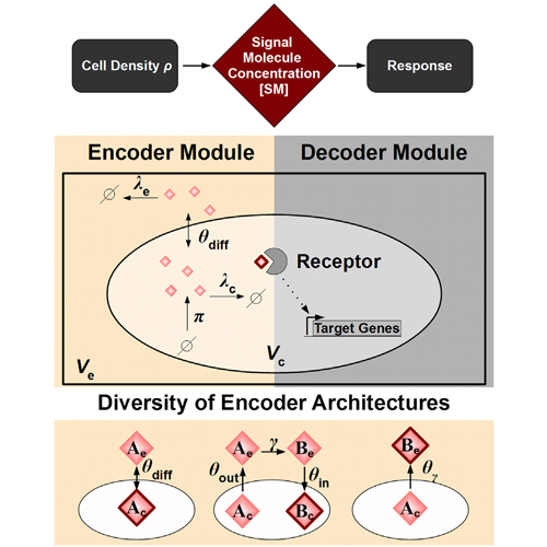 Certain environmental parameters are accessible to cells only indirectly and require an encoding step for cells to retrieve the relevant information. A prominent example is the phenomenon of quorum sensing by microorganisms, where information about cell density is encoded by means of secreted signaling molecules. The mapping of cell density to signal molecule concentration and the corresponding network modules involved have been at least partially characterized in many bacteria, and vary markedly between different systems. In this study, we investigate theoretically how differences in signal transport, signal modification, and site of signal detection shape the encoding function and affect the sensitivity and the noise characteristics of the cell-density-encoding process. We find that different modules are capable of implementing both fairly basic as well as more complex encoding schemes, whose qualitative characteristics vary with cell density and are linked to network architecture, providing the basis for a hierarchical classification scheme. We exploit the tight relationship between encoding behavior and network architecture to constrain the network topology of partially characterized natural systems, and verify one such prediction by showing experimentally that Vibrio harveyi is capable of importing Autoinducer 2. The framework developed in this research can serve not only to guide reverse engineering of natural systems but also to stimulate the design of synthetic systems and generally facilitate a better understanding of the complexities arising in the quorum-sensing process because of variations in the physical organization of the encoder network module.