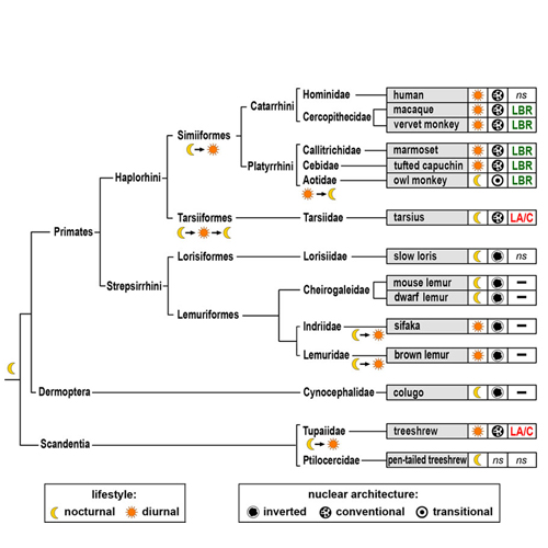 Diurnality, associated with enhanced visual acuity and color vision, is typical of most modern Primates. However, it remains a matter of debate when and how many times primates re-acquired diurnality or returned to nocturnality. We analyzed the features specific to nocturnal and diurnal vision that were recently found in the nuclei of mammalian rod photoreceptor cells in 11 species representing various groups of the Primates and related tree shrew and colugo. In particular, heterochromatin in rod nuclei of nocturnal mammals is clustered in the center of rod nuclei (inverted architecture), whereas rods of diurnal mammals retain rods with peripheral heterochromatin (conventional architecture). Rod nuclei of the nocturnal owl monkey have a state transitional to the inverted one. Surprisingly, rod nuclei of the tarsier have a conventional nuclear architecture typical for diurnal mammals, strongly implying that recent Tarsiiformes returned to nocturnality from the diurnal state. Diurnal lemurs retain inverted rod nuclei typical of nocturnal mammals, which conforms to the notion that the ancestors of all Lemuroidea were nocturnal. Data on the expression of proteins indispensable for peripheral heterochromatin maintenance (and, respectively, conventional or inverted nuclear organization) in rod cells support the view that the primate ancestors were nocturnal and transition to diurnality occurred independently in several primate and related groups: Tupaia, diurnal lemurs, and, at least partially independently, in Simiiformes (monkeys and apes) and Tarsiiformes.