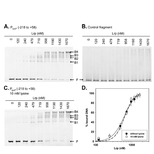 Expression of lysP, which encodes the lysine-specific transporter LysP in Escherichia coli, is regulated by the concentration of exogenous available lysine. In this study, the LysR-type transcriptional regulator ArgP was identified as the activator of lysP expression. At lysine concentrations higher than 25 µM, lysP expression was shut off and phenocopied an argP deletion mutant. Purified ArgP-His6 bound to the lysP promoter/control region at a sequence containing a conserved T-N11-A motif. Its affinity increased in the presence of lysine but not in the presence of the other known coeffector, arginine. In vivo data suggest that lysine-loaded ArgP and arginine-loaded ArgP compete at the lysP promoter. We propose that lysine-loaded ArgP prevents lysP transcription at the promoter clearance step, as described for the lysine-dependent regulation of argO (R. S. Laishram and J. Gowrishankar, Genes Dev. 21:1258-1272, 2007). The global regulator Lrp also bound to the lysP promoter/control region. An lrp mutant exhibited reduced lysP expression in the absence of external lysine. These results indicate that ArgP is a major regulator of lysP expression but that Lrp modulates lysP transcription under lysine-limiting conditions.