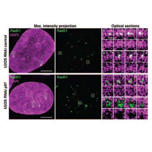 Cdc48 (also known as p97), a conserved chaperone-like ATPase, plays a strategic role in the ubiquitin system1, 2, 3. Empowered by ATP-driven conformational changes 4, Cdc48 acts as a segregase by dislodging ubiquitylated proteins from their environment1, 2, 5. Ufd1, a known co-factor of Cdc48, also binds SUMO (ref. 6), but whether SUMOylated proteins are subject to the segregase activity of Cdc48 as well and what these substrates are remains unknown. Here we show that Cdc48 with its co-factor Ufd1 is SUMO-targeted to proteins involved in DNA double-strand break repair. Cdc48 associates with SUMOylated Rad52, a factor that assembles the Rad51 recombinase on chromatin. By acting on the Rad52–Rad51 complex, Cdc48 curbs their physical interaction and displaces the proteins from DNA. Genetically interfering with SUMO-targeting or segregase activity leads to an increase in spontaneous recombination rates, accompanied by aberrant in vivo Rad51 foci formation in yeast and mammalian cells. Our data thus suggest that SUMO-targeted Cdc48 restricts the recombinase Rad51 by counterbalancing the activity of Rad52. We propose that Cdc48, through its ability to associate with co-factors that have affinities for ubiquitin and SUMO, connects the two modification pathways for protein degradation or other regulatory purposes.