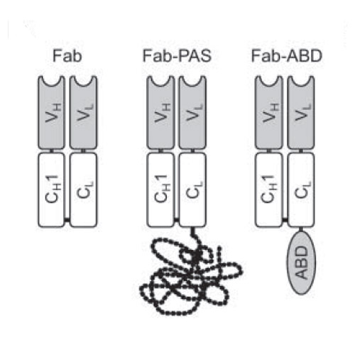 Although antigen-binding fragments (Fabs) of antibodies constitute established tracers for in vivo radiodiagnostics, their functionality is hampered by a very short circulation half-life. PASylation, the genetic fusion with a long, conformationally disordered amino acid chain comprising Pro, Ala and Ser, provides a convenient way to expand protein size and, consequently, retard renal filtration. Humanized αHER2 and αCD20 Fabs were systematically fused with 100 to 600 PAS residues and produced in E. coli. Cytofluorimetric titration analysis on tumor cell lines confirmed that antigen-binding activities of the parental antibodies were retained. The radio-iodinated PASylated Fabs were studied by positron emission tomography (PET) imaging and biodistribution analysis in mouse tumor xenograft models. While the unmodified αHER2 and αCD20 Fabs showed weak tumor uptake (0.8% and 0.2% ID/g, respectively; 24 h p.i.) tumor-associated radioactivity was boosted with increasing PAS length (up to 9 and 26-fold, respectively), approaching an optimum for Fab-PAS400. Remarkably, 6- and 5-fold higher tumor-to-blood ratios compared with the unmodified Fabs were measured in the biodistribution analysis (48 h p.i.) for αHER2 Fab-PAS100 and Fab-PAS200, respectively. These findings were confirmed by PET studies, showing high imaging contrast in line with tumor-to-blood ratios of 12.2 and 5.7 (24 h p.i.) for αHER2 Fab-PAS100 and Fab-PAS200. Even stronger tumor signals were obtained with the corresponding αCD20 Fabs, both in PET imaging and biodistribution analysis, with an uptake of 2.8% ID/g for Fab-PAS100vs. 0.24% ID/g for the unmodified Fab. Hence, by engineering Fabs via PASylation, plasma half-life can be tailored to significantly improve tracer uptake and tumor contrast, thus optimally matching reagent/target interactions