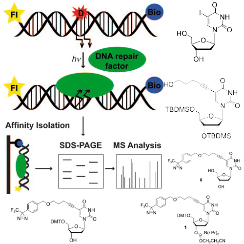 An investigation of the precise interactions between damaged DNA and DNA repair enzymes is required in order to understand the lesion recognition step, which is one of the most fundamental processes in DNA repair. Most recently, photoaffinity labeling approaches have enabled the analysis of even transient protein- DNA interactions. Here we report the synthesis and evaluation of oligonucleotides that contain two photoaffinity “catcher moieties” next to incorporated DNA lesions. With these DNA constructs it is possible to analyze the interactions between DNA lesions and the appropriate repair enzymes. The probes labeled the repair protein efficiently enough to enable subsequent protein analysis by mass spectrometry.