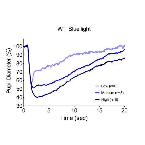 Results: Rho−/− mice showed decreased constriction amplitude but more prolonged pupilloconstriction to all blue and red light stimuli compared to wild type mice. Cnga3−/− mice had constriction amplitudes similar to WT however following maximal constriction, the early and rapid dilation to low intensity blue light was decreased. To high intensity blue light, the Cnga3−/− mice demonstrated marked prolongation of the pupillary constriction. Cnga3−/−; Rho−/− mice had no pupil response to red light of low and medium intensity.