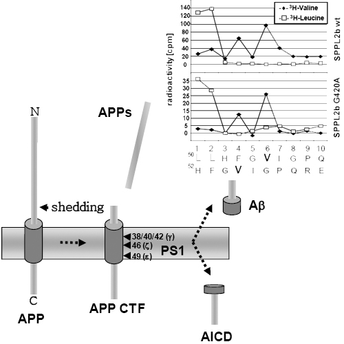 More than one hundred and fifty familial Alzheimer's Disease (FAD)-associated missense mutations in presenilins (PS1 and PS2), the catalytic subunit of the γ- secretase complex, cause aberrant Amyloid β-peptide (Aβ) production, by increasing the relative production of the highly amyloidogenic 42 amino acid variant. The molecular mechanism behind this pathological activity is unclear and different possibilities ranging from a gain of function to a loss of function have been discussed. γ-Secretase, signal peptide peptidase (SPP) and SPP-like proteases (SPPLs) belong to the same family of GxGD-type intramembrane cleaving aspartyl proteases and share several functional similarities. We have introduced the FAD-associated PS1 G384A mutation, which occurs within the highly conserved GxGD motif of PS1 right next to the catalytically critical aspartate residue, into the corresponding GxGD motif of the signal peptide peptidase-like 2b (SPPL2b). Compared to wt SPPL2b, mutant SPPL2b slowed intramembrane proteolysis of tumor necrosis factor α (TNFα) and cause a relative increase of longer intracellular cleavage products.Since the N-termini of the secreted counterparts remain unchanged, the mutation selectively affects the liberation of the intracellular processing products. In vitro experiments demonstrate that the apparent accumulation of longer intracellular cleavage products is the result of slowed sequential intramembrane cleavage. The longer cleavage products are still converted to shorter peptides, however only after prolonged incubation time. This suggests that FAD-associated PS mutation may also result in reduced intramembrane cleavage of β-Amyloid Precursor Protein (βAPP). Indeed, in vitro experiments demonstrate slowed intramembrane proteolysis by γ-secretase containing PS1 with the G384A mutation. As compared to wt PS1, the mutation selectively slowed Aβ40 production, while Aβ42 generation remained unaffected. Thus, the PS1 G384A mutation causes a selective loss of function by slowing the processing pathway leading to the benign Aβ40.