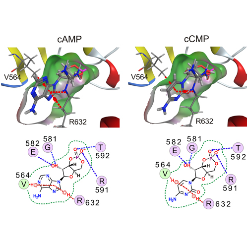 Activation of hyperpolarization-activated cyclic nucleotide-gated (HCN) channels is facilitated in vivo by direct binding of the second messenger cAMP. This process plays a fundamental role in the fine-tuning of HCN channel activity and is critical for the modulation of cardiac and neuronal rhythmicity. Here, we identify the pyrimidine cyclic nucleotide cCMP as another regulator of HCN channels. We demonstrate that cCMP shifts the activation curves of two members of the HCN channel family, HCN2 and HCN4, to more depolarized voltages. Moreover, cCMP speeds up activation and slows down deactivation kinetics of these channels. The two other members of the HCN channel family, HCN1 and HCN3, are not sensitive to cCMP. The modulatory effect of cCMP is reversible and requires the presence of a functional cyclic nucleotide-binding domain. We determined an EC50 value of ∼30 μm for cCMP compared with 1 μm for cAMP. Notably, cCMP is a partial agonist of HCN channels, displaying an efficacy of ∼0.6. cCMP increases the frequency of pacemaker potentials from isolated sinoatrial pacemaker cells in the presence of endogenous cAMP concentrations. Electrophysiological recordings indicated that this increase is caused by a depolarizing shift in the activation curve of the native HCN current, which in turn leads to an enhancement of the slope of the diastolic depolarization of sinoatrial node cells. In conclusion, our findings establish cCMP as a gating regulator of HCN channels and indicate that this cyclic nucleotide has to be considered in HCN channel-regulated processes.